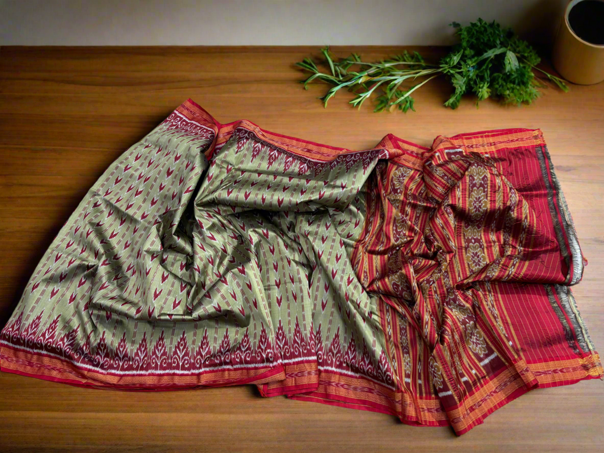 wherein the warp and the weft are tie-dyed before weaving. Sambalpuri sarees incorporate traditional motifs like shankha (conch),chakra(wheel), phula (flower), all of which have deep symbolism with the native Odia culture.