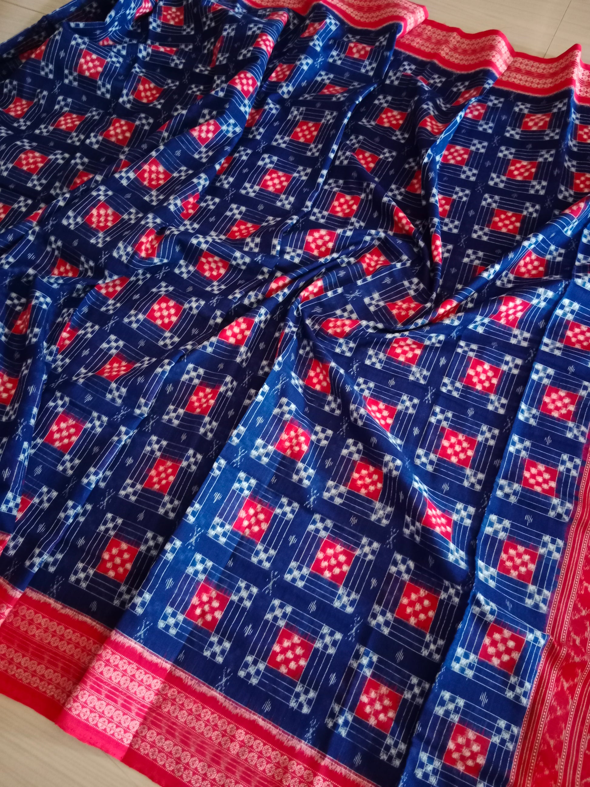 Weaver communities of Maniabandha and Nuapatana of Odisha traditionally weave this kind of saree. Common motifs are star, temple, conch, rudraksh, fish, chakra, lotus etc .The inspiration of all its designs comes from nature. The origin of Khandua traces back to 12th Century AD and it is closely associated with Lord Jagannath Temple rituals at Puri, Odisha. Originally designed using red, yellow, maroon, and cream colors, they contain Texts from the Gita Govinda. Gita Govinda or the song of Govinda is a work composed by the 12th century Indian poet Jayadeva. It describes the relationship between Krishna and the gopis (female cowherds), in particular Radha. Khandua is traditionally red or orange in color. The red color is prepared naturally from the shorea robusta (sal tree).The design motif has an auspicious elephant that represents Buddha surrounded by trailing vine with peacocks in it, a large many petaled flower, a unique Odisha's animal called Nabagunjar, a deula kumbha. The elephant in Khandua ikat from Nuapatana usually varies from elephant motives in ikat from sambalpuri saree as well as ikat from other parts of Orissa. Khandua has plain borders in contrary to borders with motifs in case of the other ikat of Odisha. During the rule of Gajapatis , Sarees are made and transported to jagannath temple. Khandua saree made of one piece of khandua silk called caukandika. Lightweight, soft, pocket-friendly, stunning. Khandua cottons are every woman's go-to sarees due to such endearing qualities.