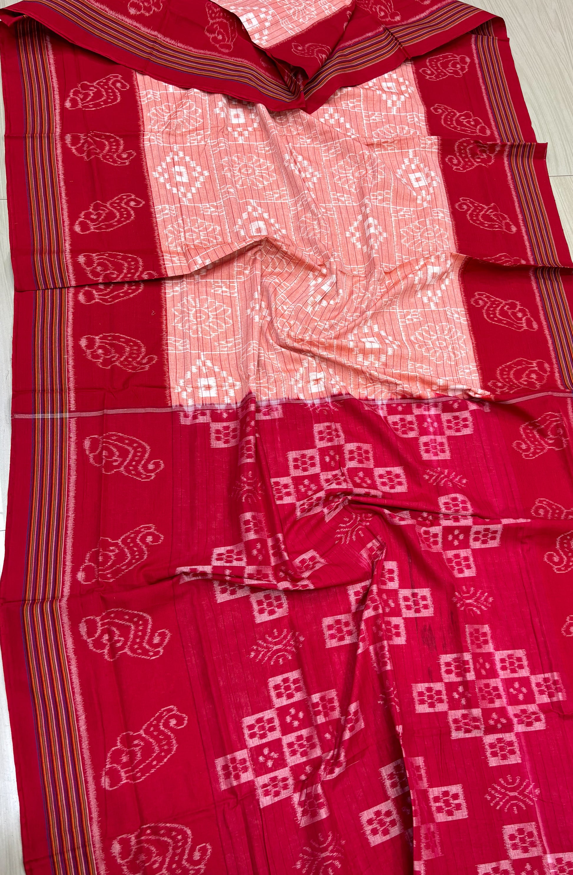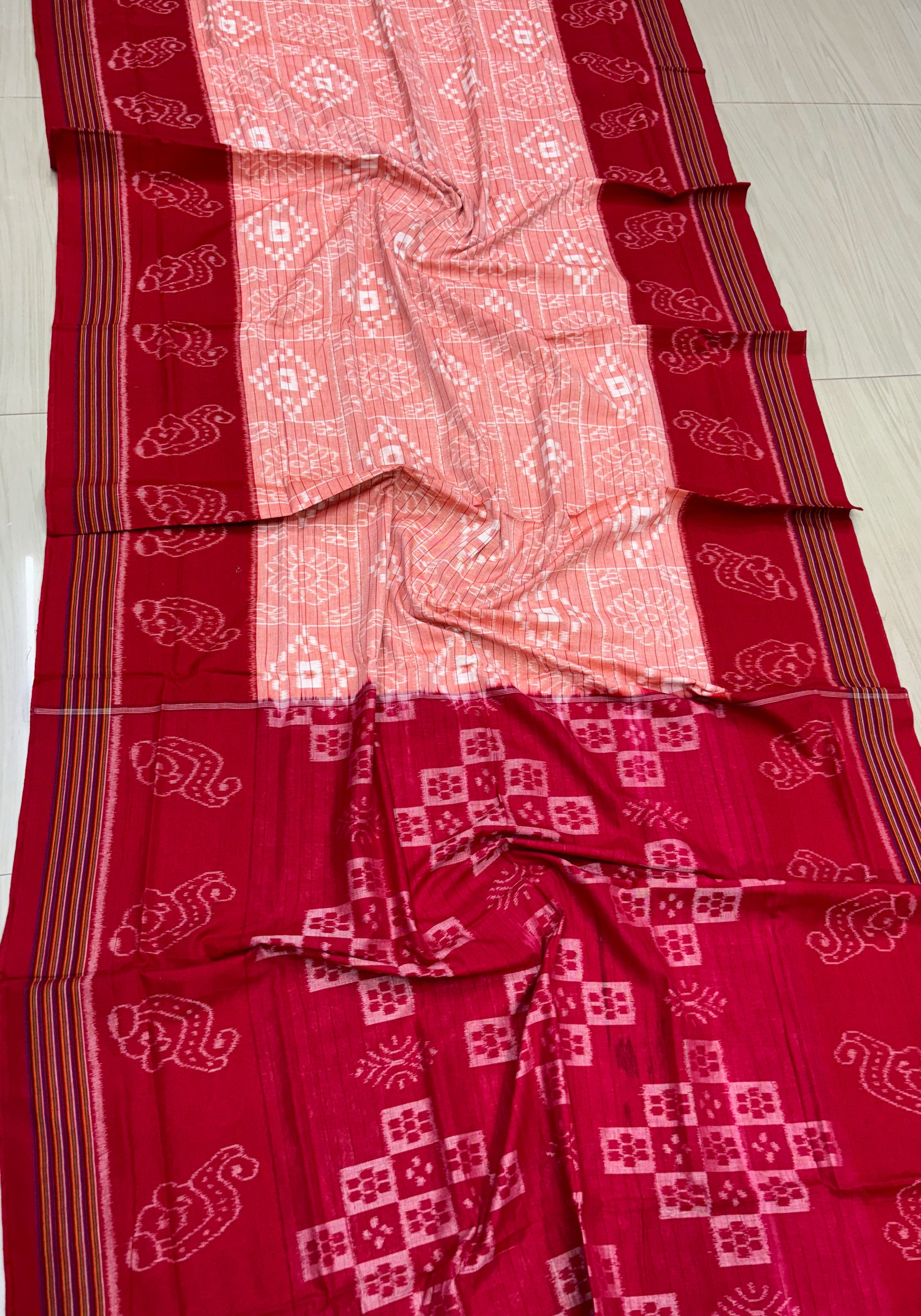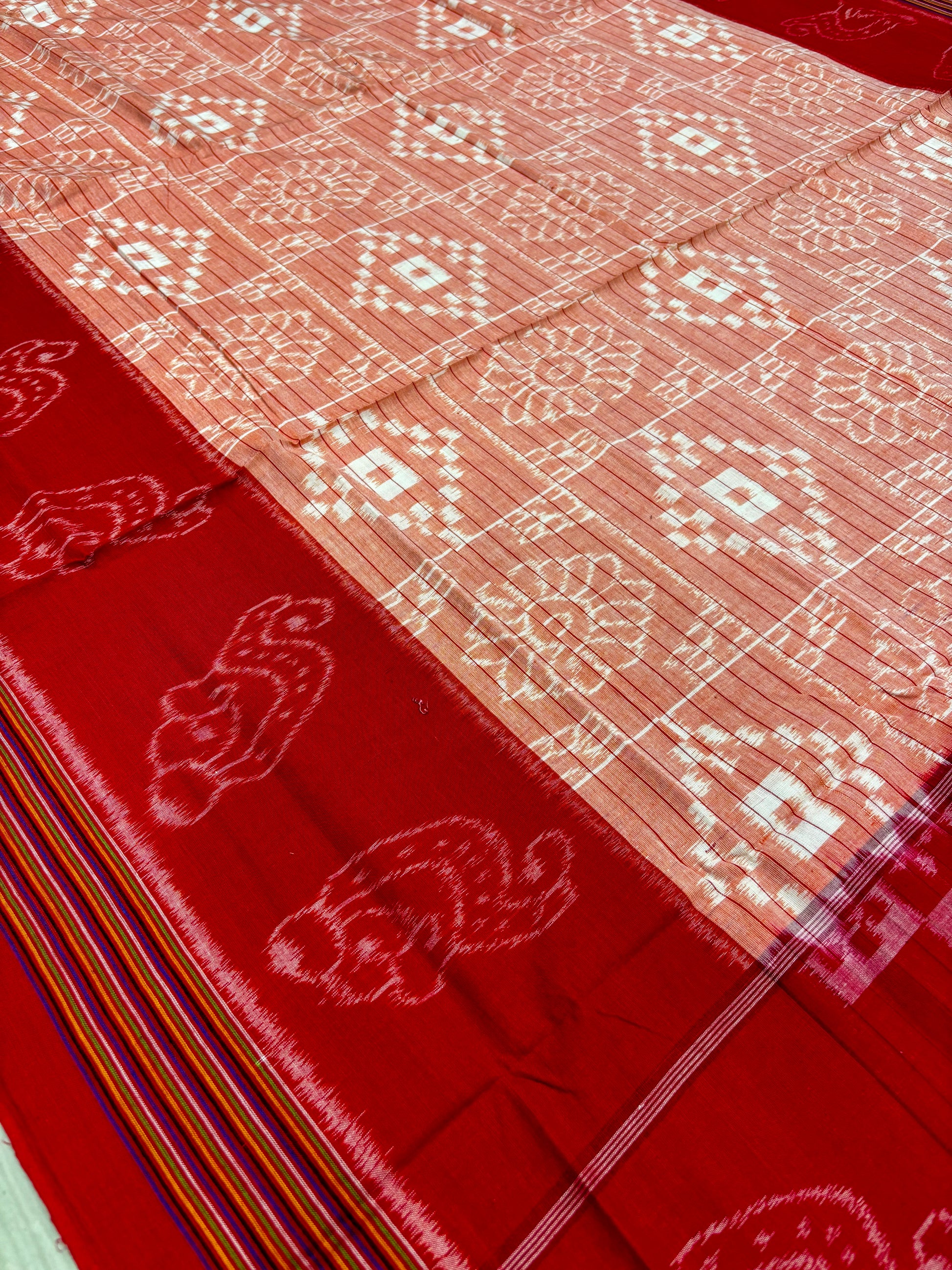 Weaver communities of Maniabandha and Nuapatana of Odisha traditionally weave this kind of saree. Common motifs are star, temple, conch, rudraksh, fish, chakra, lotus etc .The inspiration of all its designs comes from nature. The origin of Khandua traces back to 12th Century AD and it is closely associated with Lord Jagannath Temple rituals at Puri, Odisha. Originally designed using red, yellow, maroon, and cream colors, they contain Texts from the Gita Govinda. Gita Govinda or the song of Govinda is a work composed by the 12th century Indian poet Jayadeva. It describes the relationship between Krishna and the gopis (female cowherds), in particular Radha. Khandua is traditionally red or orange in color. The red color is prepared naturally from the shorea robusta (sal tree).The design motif has an auspicious elephant that represents Buddha surrounded by trailing vine with peacocks in it, a large many petaled flower, a unique Odisha's animal called Nabagunjar, a deula kumbha. The elephant in Khandua ikat from Nuapatana usually varies from elephant motives in ikat from sambalpuri saree as well as ikat from other parts of Orissa. Khandua has plain borders in contrary to borders with motifs in case of the other ikat of Odisha. During the rule of Gajapatis , Sarees are made and transported to jagannath temple. Khandua saree made of one piece of khandua silk called caukandika. Lightweight, soft, pocket-friendly, stunning. Khandua cottons are every woman's go-to sarees due to such endearing qualities.