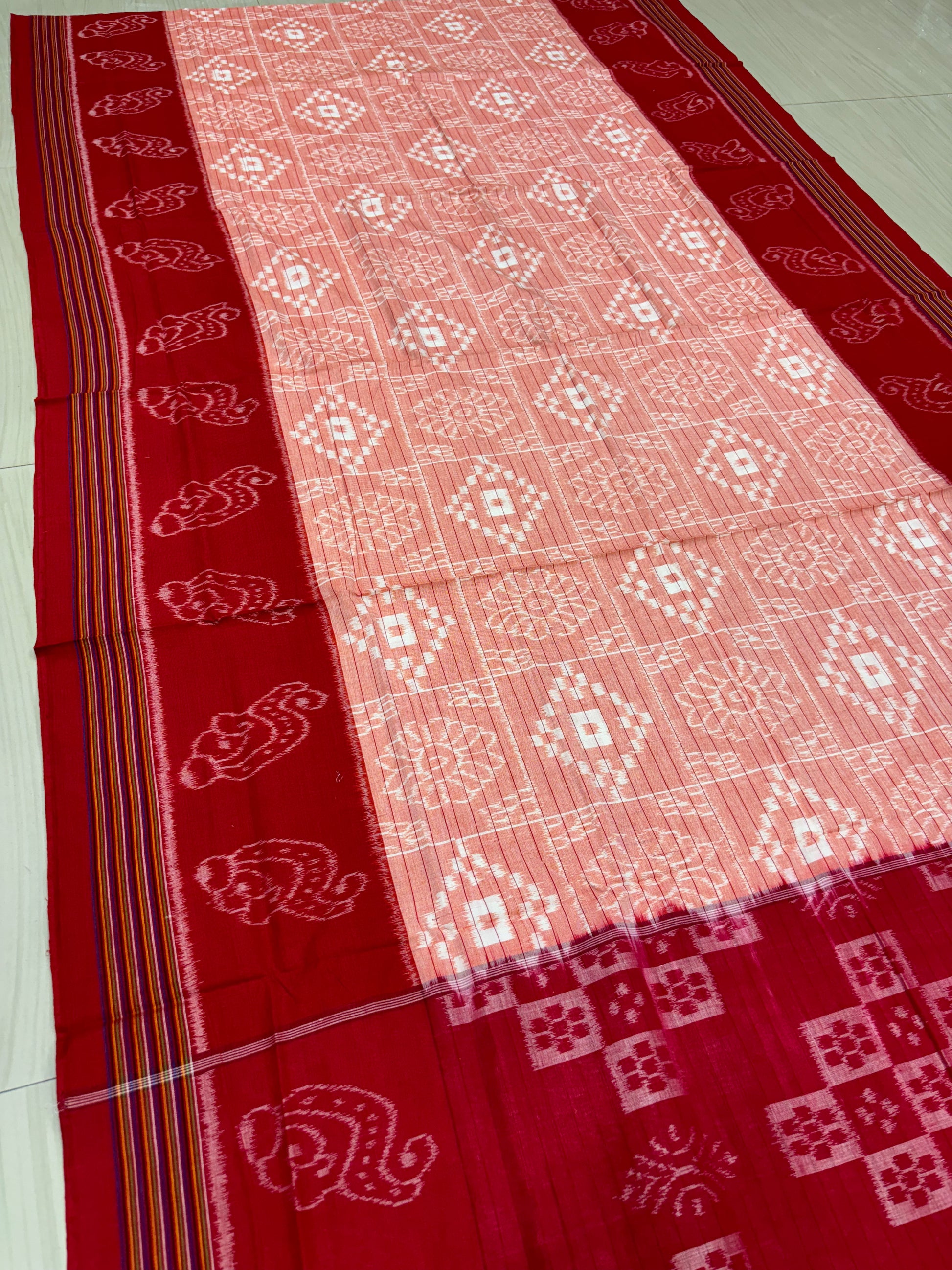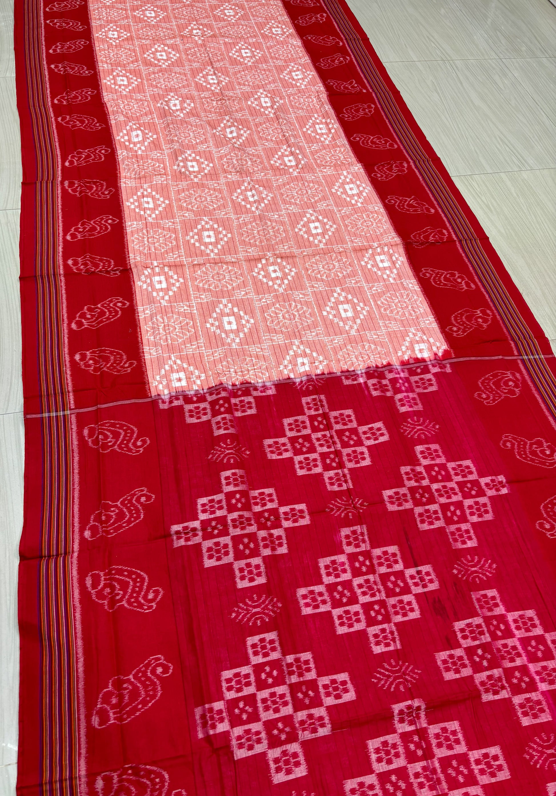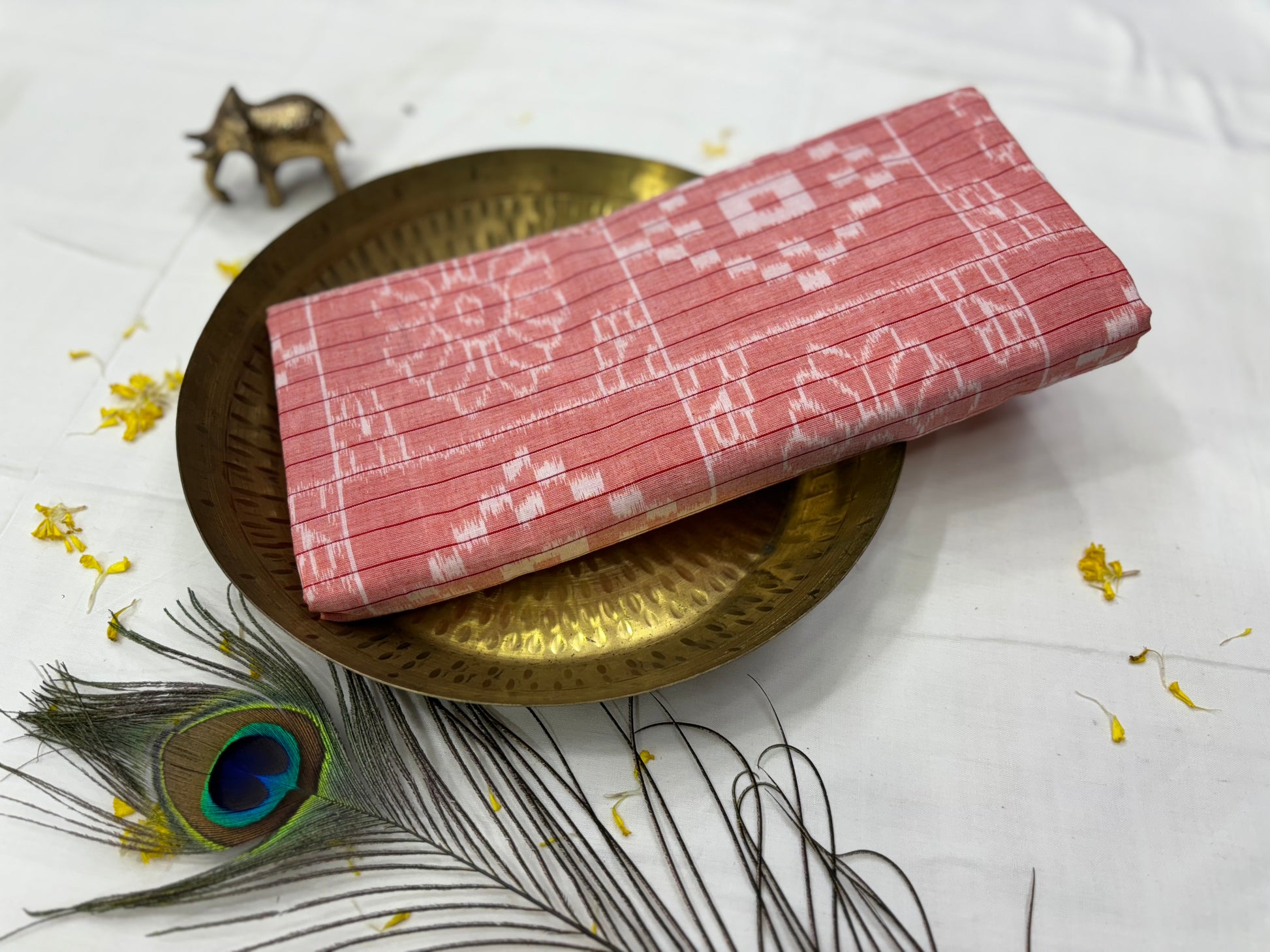 Weaver communities of Maniabandha and Nuapatana of Odisha traditionally weave this kind of saree. Common motifs are star, temple, conch, rudraksh, fish, chakra, lotus etc .The inspiration of all its designs comes from nature. The origin of Khandua traces back to 12th Century AD and it is closely associated with Lord Jagannath Temple rituals at Puri, Odisha. Originally designed using red, yellow, maroon, and cream colors, they contain Texts from the Gita Govinda. Gita Govinda or the song of Govinda is a work composed by the 12th century Indian poet Jayadeva. It describes the relationship between Krishna and the gopis (female cowherds), in particular Radha. Khandua is traditionally red or orange in color. The red color is prepared naturally from the shorea robusta (sal tree).The design motif has an auspicious elephant that represents Buddha surrounded by trailing vine with peacocks in it, a large many petaled flower, a unique Odisha's animal called Nabagunjar, a deula kumbha. The elephant in Khandua ikat from Nuapatana usually varies from elephant motives in ikat from sambalpuri saree as well as ikat from other parts of Orissa. Khandua has plain borders in contrary to borders with motifs in case of the other ikat of Odisha. During the rule of Gajapatis , Sarees are made and transported to jagannath temple. Khandua saree made of one piece of khandua silk called caukandika. Lightweight, soft, pocket-friendly, stunning. Khandua cottons are every woman's go-to sarees due to such endearing qualities.