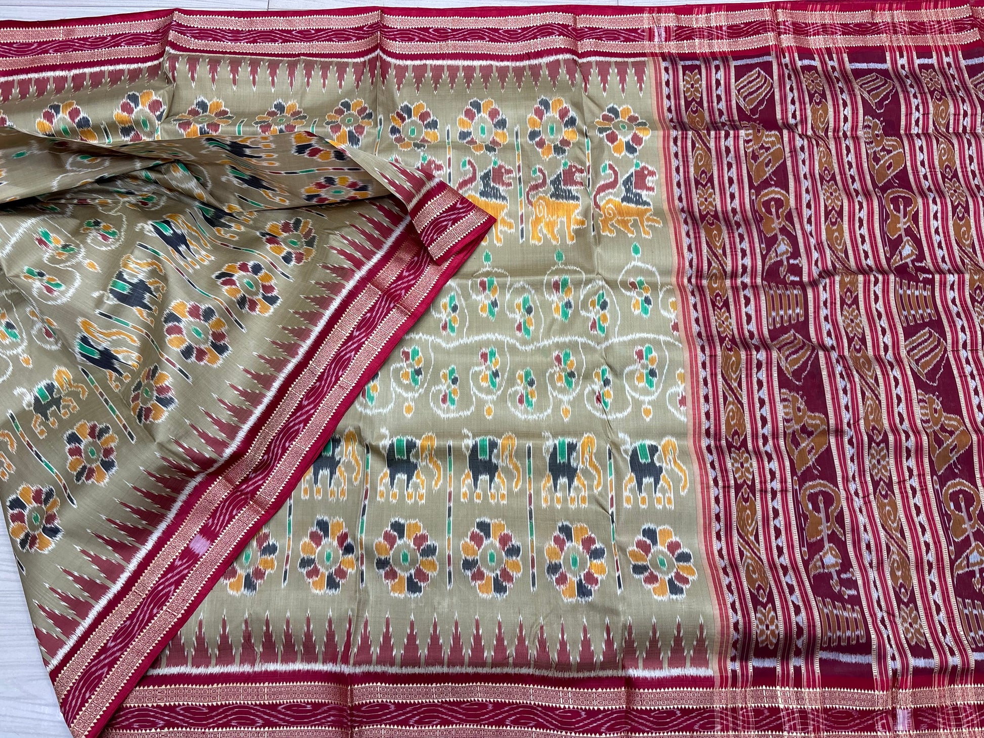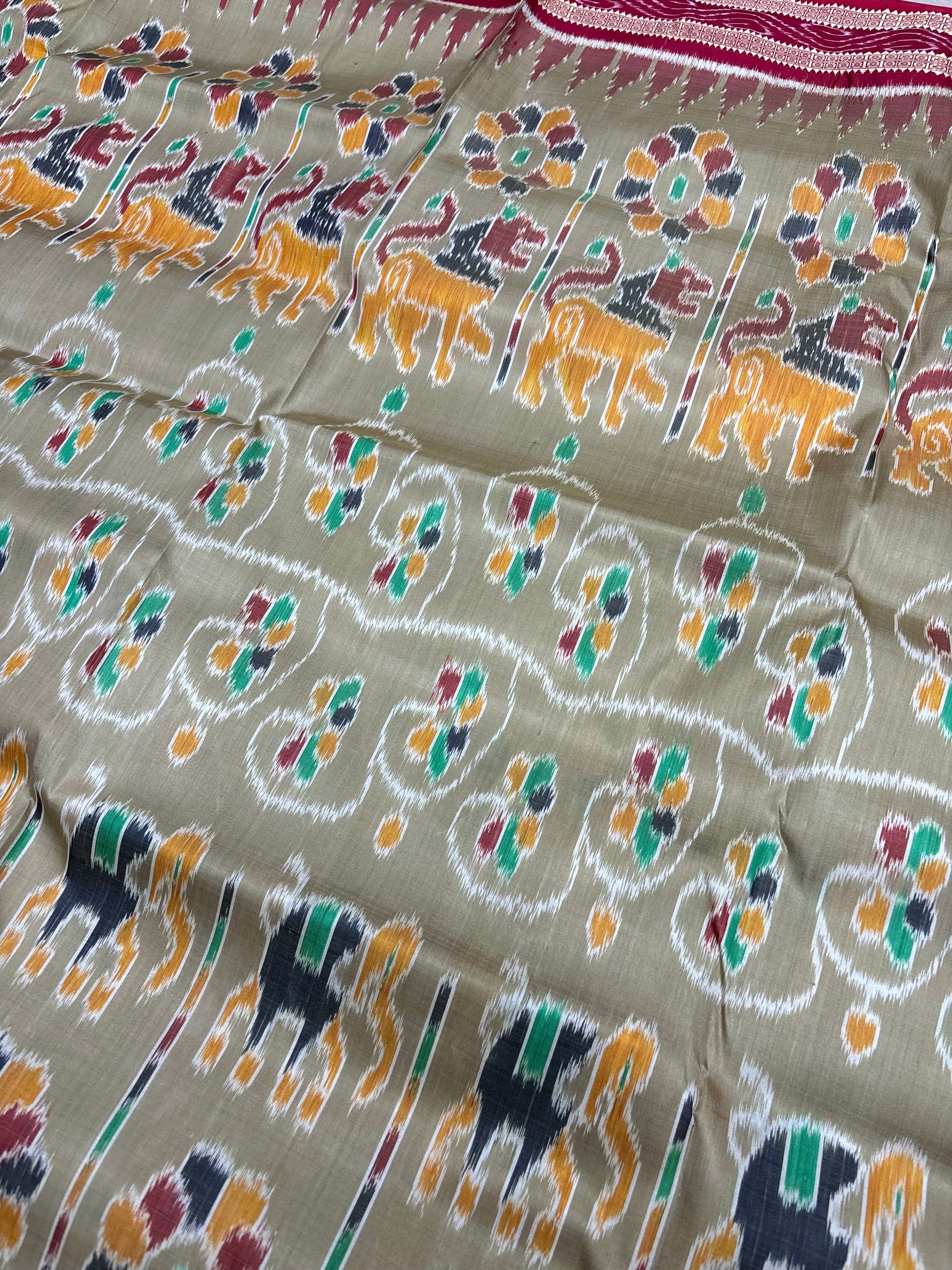 Weaver communities of Maniabandha and Nuapatana of Odisha traditionally weave this kind of saree. Common motifs are star, temple, conch, rudraksh, fish, chakra, lotus etc .The inspiration of all its designs comes from nature. The origin of Khandua traces back to 12th Century AD and it is closely associated with Lord Jagannath Temple rituals at Puri, Odisha. Originally designed using red, yellow, maroon, and cream colors, they contain Texts from the Gita Govinda. Gita Govinda or the song of Govinda is a work composed by the 12th century Indian poet Jayadeva. It describes the relationship between Krishna and the gopis (female cowherds), in particular Radha. Khandua is traditionally red or orange in color. The red color is prepared naturally from the shorea robusta (sal tree).The design motif has an auspicious elephant that represents Buddha surrounded by trailing vine with peacocks in it, a large many petaled flower, a unique Odisha's animal called Nabagunjar, a deula kumbha. The elephant in Khandua ikat from Nuapatana usually varies from elephant motives in ikat from sambalpuri saree as well as ikat from other parts of Orissa. Khandua has plain borders in contrary to borders with motifs in case of the other ikat of Odisha. During the rule of Gajapatis , Sarees are made and transported to jagannath temple. Khandua saree made of one piece of khandua silk called caukandika. Lightweight, soft, pocket-friendly, stunning. Khandua cottons are every woman's go-to sarees due to such endearing qualities.