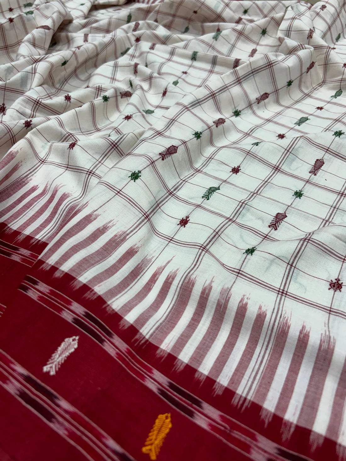 Weaver communities of Maniabandha and Nuapatana of Odisha traditionally weave this kind of saree. Common motifs are star, temple, conch, rudraksh, fish, chakra, lotus etc .The inspiration of all its designs comes from nature. The origin of Khandua traces back to 12th Century AD and it is closely associated with Lord Jagannath Temple rituals at Puri, Odisha. Originally designed using red, yellow, maroon, and cream colors, they contain Texts from the Gita Govinda. Gita Govinda or the song of Govinda is a work composed by the 12th century Indian poet Jayadeva. It describes the relationship between Krishna and the gopis (female cowherds), in particular Radha. Khandua is traditionally red or orange in color. The red color is prepared naturally from the shorea robusta (sal tree).The design motif has an auspicious elephant that represents Buddha surrounded by trailing vine with peacocks in it, a large many petaled flower, a unique Odisha's animal called Nabagunjar, a deula kumbha. The elephant in Khandua ikat from Nuapatana usually varies from elephant motives in ikat from sambalpuri saree as well as ikat from other parts of Orissa. Khandua has plain borders in contrary to borders with motifs in case of the other ikat of Odisha. During the rule of Gajapatis , Sarees are made and transported to jagannath temple. Khandua saree made of one piece of khandua silk called caukandika. Lightweight, soft, pocket-friendly, stunning. Khandua cottons are every woman's go-to sarees due to such endearing qualities.