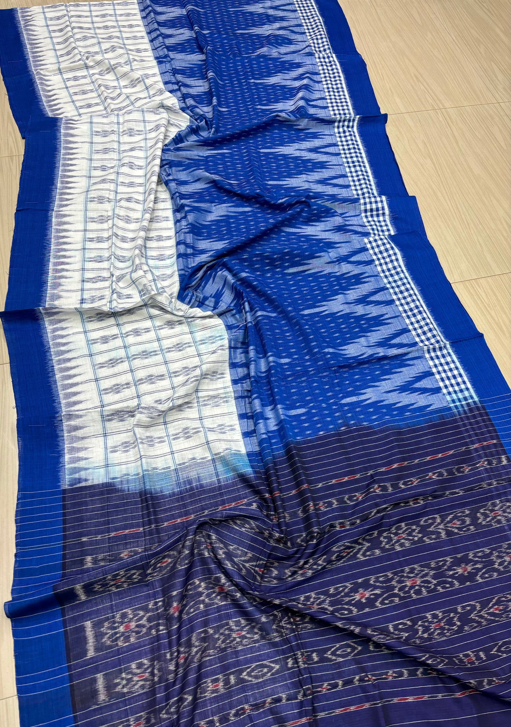Weaver communities of Maniabandha and Nuapatana of Odisha traditionally weave this kind of saree. Common motifs are star, temple, conch, rudraksh, fish, chakra, lotus etc .The inspiration of all its designs comes from nature. The origin of Khandua traces back to 12th Century AD and it is closely associated with Lord Jagannath Temple rituals at Puri, Odisha. Originally designed using red, yellow, maroon, and cream colors, they contain Texts from the Gita Govinda. Gita Govinda or the song of Govinda is a work composed by the 12th century Indian poet Jayadeva. It describes the relationship between Krishna and the gopis (female cowherds), in particular Radha. Khandua is traditionally red or orange in color. The red color is prepared naturally from the shorea robusta (sal tree).The design motif has an auspicious elephant that represents Buddha surrounded by trailing vine with peacocks in it, a large many petaled flower, a unique Odisha's animal called Nabagunjar, a deula kumbha. The elephant in Khandua ikat from Nuapatana usually varies from elephant motives in ikat from sambalpuri saree as well as ikat from other parts of Orissa. Khandua has plain borders in contrary to borders with motifs in case of the other ikat of Odisha. During the rule of Gajapatis , Sarees are made and transported to jagannath temple. Khandua saree made of one piece of khandua silk called caukandika. Lightweight, soft, pocket-friendly, stunning. Khandua cottons are every woman's go-to sarees due to such endearing qualities.