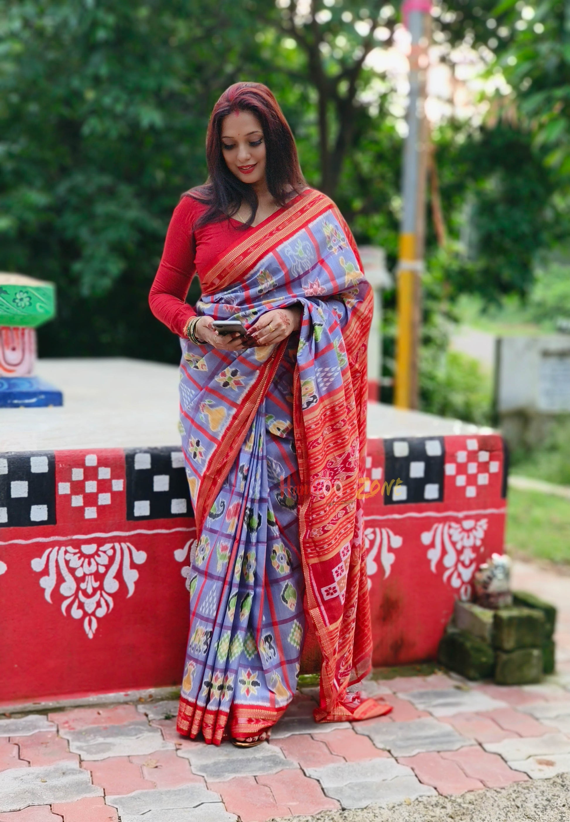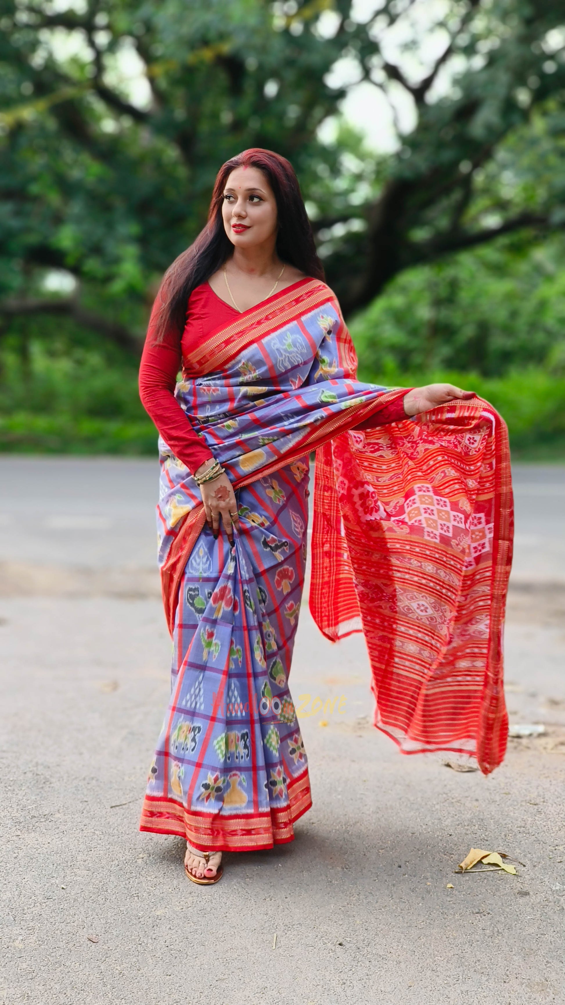 Weaver communities of Maniabandha and Nuapatana of Odisha traditionally weave this kind of saree. Common motifs are star, temple, conch, rudraksh, fish, chakra, lotus etc .The inspiration of all its designs comes from nature. The origin of Khandua traces back to 12th Century AD and it is closely associated with Lord Jagannath Temple rituals at Puri, Odisha. Originally designed using red, yellow, maroon, and cream colors, they contain Texts from the Gita Govinda. Gita Govinda or the song of Govinda is a work composed by the 12th century Indian poet Jayadeva. It describes the relationship between Krishna and the gopis (female cowherds), in particular Radha. Khandua is traditionally red or orange in color. The red color is prepared naturally from the shorea robusta (sal tree).The design motif has an auspicious elephant that represents Buddha surrounded by trailing vine with peacocks in it, a large many petaled flower, a unique Odisha's animal called Nabagunjar, a deula kumbha. The elephant in Khandua ikat from Nuapatana usually varies from elephant motives in ikat from sambalpuri saree as well as ikat from other parts of Orissa. Khandua has plain borders in contrary to borders with motifs in case of the other ikat of Odisha. During the rule of Gajapatis , Sarees are made and transported to jagannath temple. Khandua saree made of one piece of khandua silk called caukandika. Lightweight, soft, pocket-friendly, stunning. Khandua cottons are every woman's go-to sarees due to such endearing qualities.