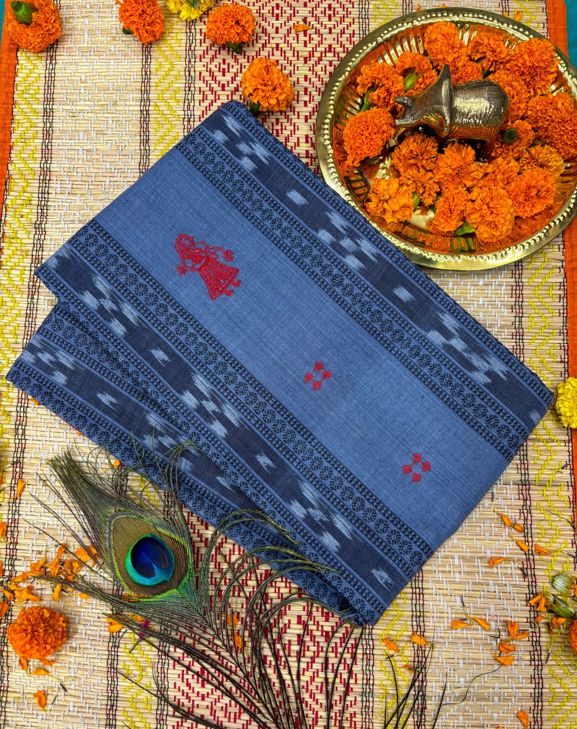 Weaver communities of Maniabandha and Nuapatana of Odisha traditionally weave this kind of saree. Common motifs are star, temple, conch, rudraksh, fish, chakra, lotus etc .The inspiration of all its designs comes from nature. The origin of Khandua traces back to 12th Century AD and it is closely associated with Lord Jagannath Temple rituals at Puri, Odisha. Originally designed using red, yellow, maroon, and cream colors, they contain Texts from the Gita Govinda. Gita Govinda or the song of Govinda is a work composed by the 12th century Indian poet Jayadeva. It describes the relationship between Krishna and the gopis (female cowherds), in particular Radha. Khandua is traditionally red or orange in color. The red color is prepared naturally from the shorea robusta (sal tree).The design motif has an auspicious elephant that represents Buddha surrounded by trailing vine with peacocks in it, a large many petaled flower, a unique Odisha's animal called Nabagunjar, a deula kumbha. The elephant in Khandua ikat from Nuapatana usually varies from elephant motives in ikat from sambalpuri saree as well as ikat from other parts of Orissa. Khandua has plain borders in contrary to borders with motifs in case of the other ikat of Odisha. During the rule of Gajapatis , Sarees are made and transported to jagannath temple. Khandua saree made of one piece of khandua silk called caukandika. Lightweight, soft, pocket-friendly, stunning. Khandua cottons are every woman's go-to sarees due to such endearing qualities.