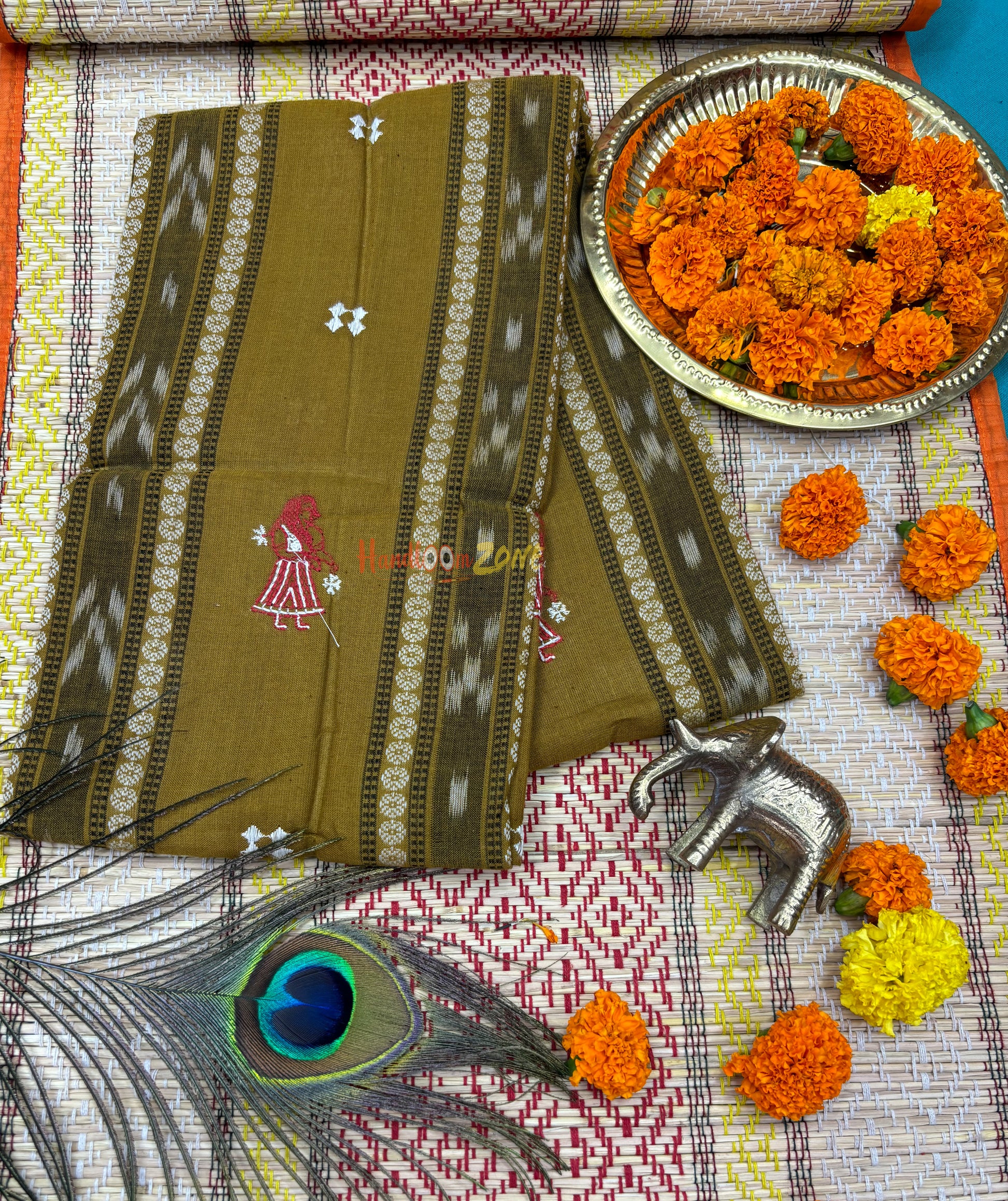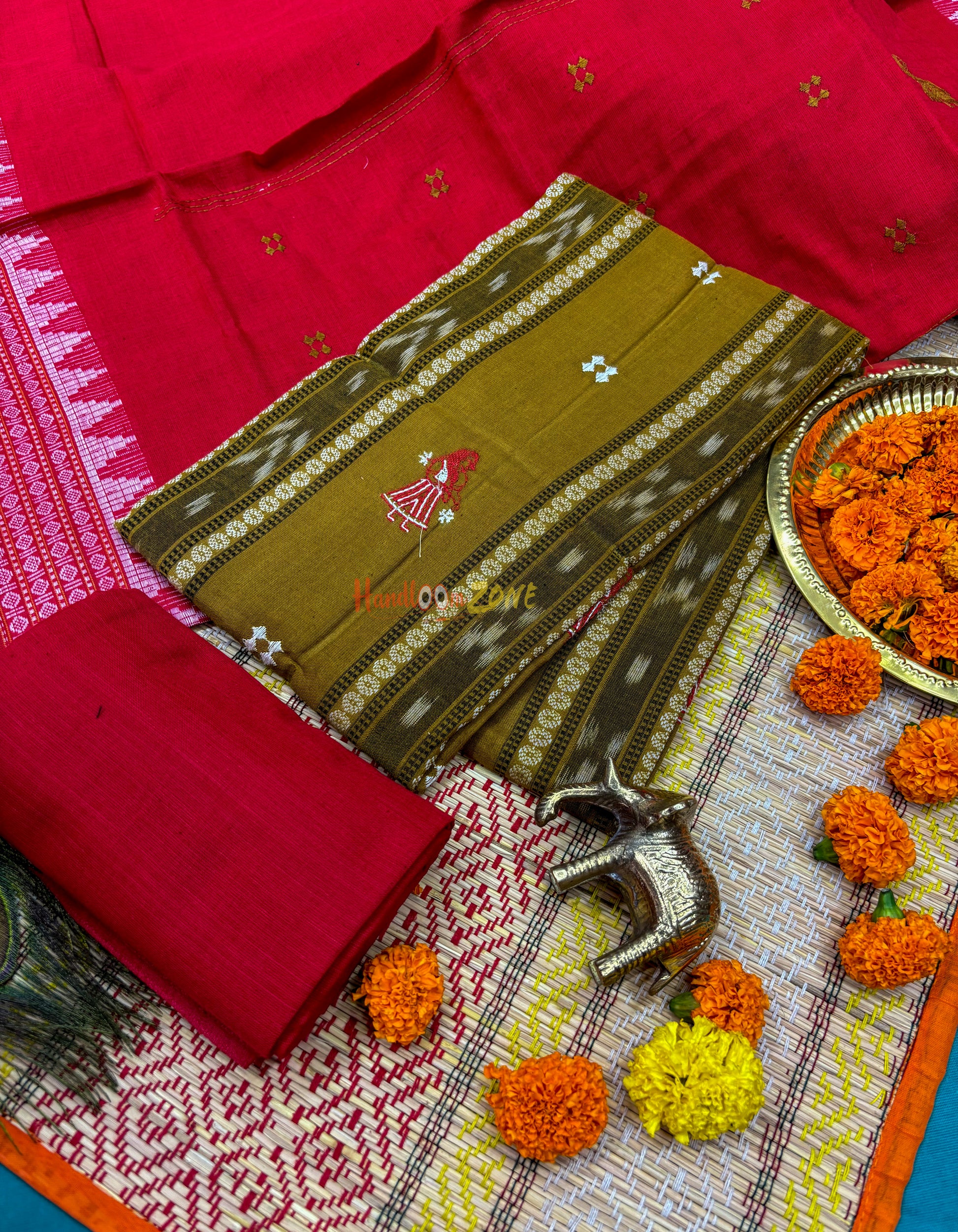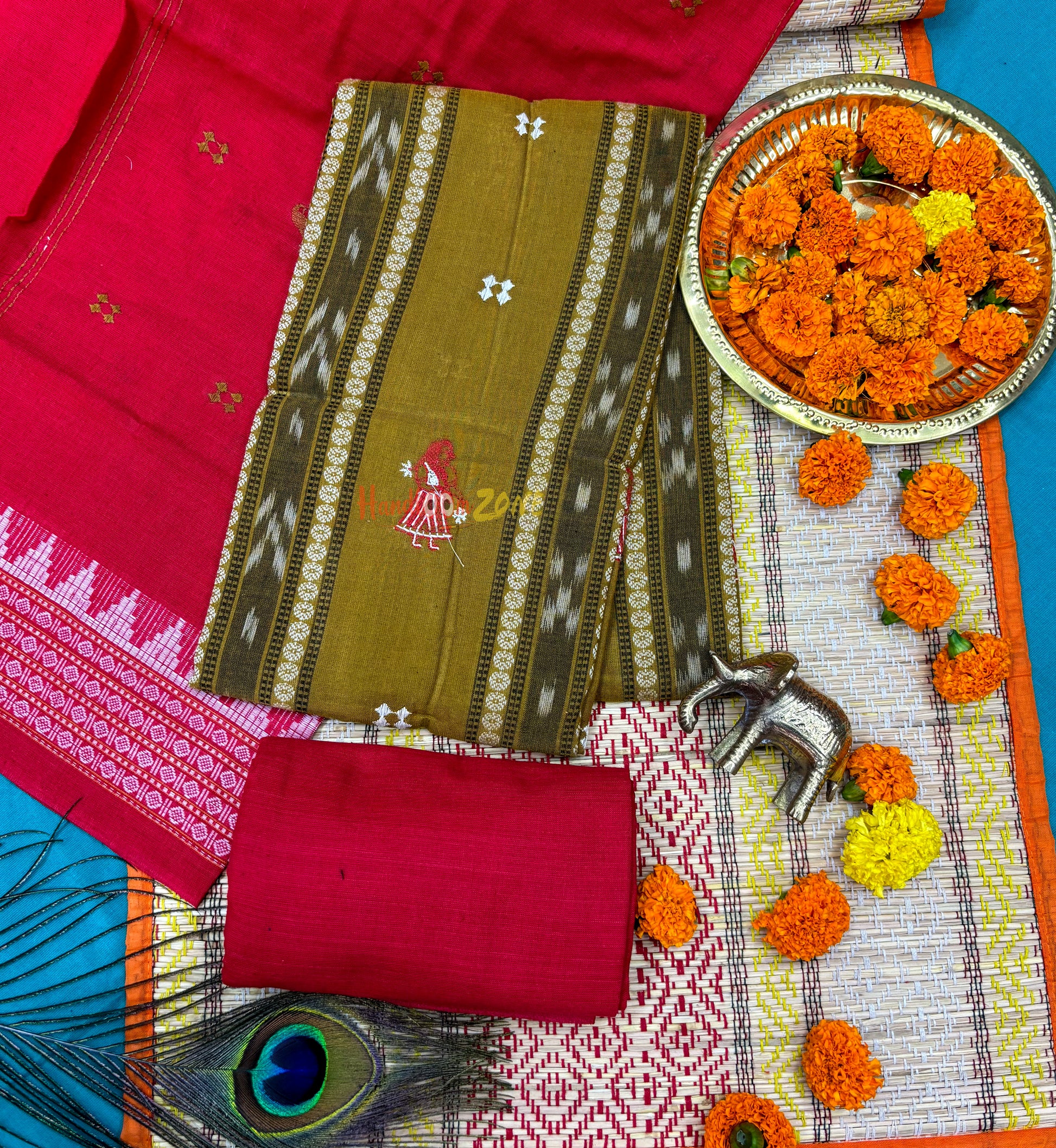 Weaver communities of Maniabandha and Nuapatana of Odisha traditionally weave this kind of saree. Common motifs are star, temple, conch, rudraksh, fish, chakra, lotus etc .The inspiration of all its designs comes from nature. The origin of Khandua traces back to 12th Century AD and it is closely associated with Lord Jagannath Temple rituals at Puri, Odisha. Originally designed using red, yellow, maroon, and cream colors, they contain Texts from the Gita Govinda. Gita Govinda or the song of Govinda is a work composed by the 12th century Indian poet Jayadeva. It describes the relationship between Krishna and the gopis (female cowherds), in particular Radha. Khandua is traditionally red or orange in color. The red color is prepared naturally from the shorea robusta (sal tree).The design motif has an auspicious elephant that represents Buddha surrounded by trailing vine with peacocks in it, a large many petaled flower, a unique Odisha's animal called Nabagunjar, a deula kumbha. The elephant in Khandua ikat from Nuapatana usually varies from elephant motives in ikat from sambalpuri saree as well as ikat from other parts of Orissa. Khandua has plain borders in contrary to borders with motifs in case of the other ikat of Odisha. During the rule of Gajapatis , Sarees are made and transported to jagannath temple. Khandua saree made of one piece of khandua silk called caukandika. Lightweight, soft, pocket-friendly, stunning. Khandua cottons are every woman's go-to sarees due to such endearing qualities.