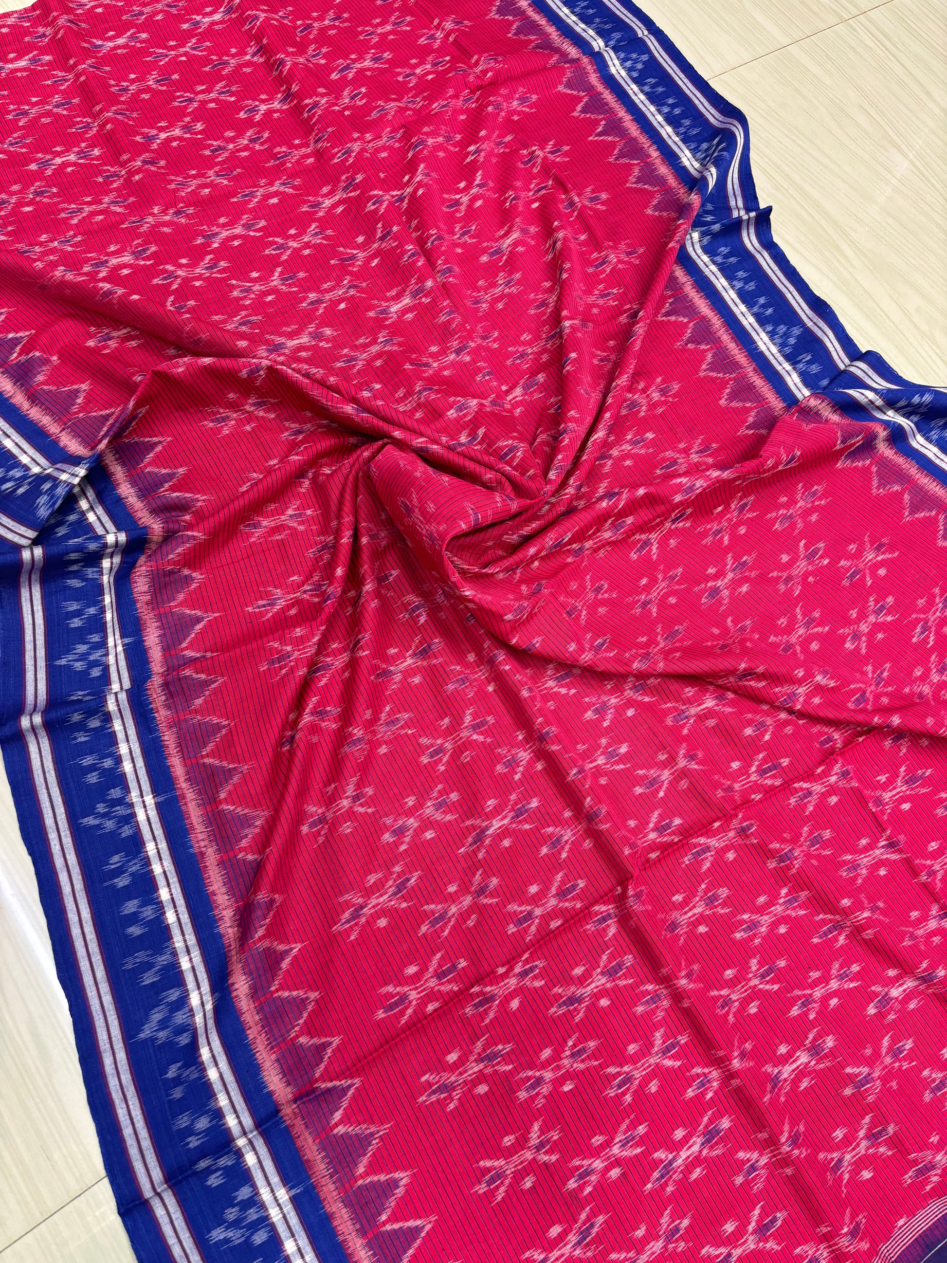 Weaver communities of Maniabandha and Nuapatana of Odisha traditionally weave this kind of saree. Common motifs are star, temple, conch, rudraksh, fish, chakra, lotus etc .The inspiration of all its designs comes from nature. The origin of Khandua traces back to 12th Century AD and it is closely associated with Lord Jagannath Temple rituals at Puri, Odisha. Originally designed using red, yellow, maroon, and cream colors, they contain Texts from the Gita Govinda. Gita Govinda or the song of Govinda is a work composed by the 12th century Indian poet Jayadeva. It describes the relationship between Krishna and the gopis (female cowherds), in particular Radha. Khandua is traditionally red or orange in color. The red color is prepared naturally from the shorea robusta (sal tree).The design motif has an auspicious elephant that represents Buddha surrounded by trailing vine with peacocks in it, a large many petaled flower, a unique Odisha's animal called Nabagunjar, a deula kumbha. The elephant in Khandua ikat from Nuapatana usually varies from elephant motives in ikat from sambalpuri saree as well as ikat from other parts of Orissa. Khandua has plain borders in contrary to borders with motifs in case of the other ikat of Odisha. During the rule of Gajapatis , Sarees are made and transported to jagannath temple. Khandua saree made of one piece of khandua silk called caukandika. Lightweight, soft, pocket-friendly, stunning. Khandua cottons are every woman's go-to sarees due to such endearing qualities.
