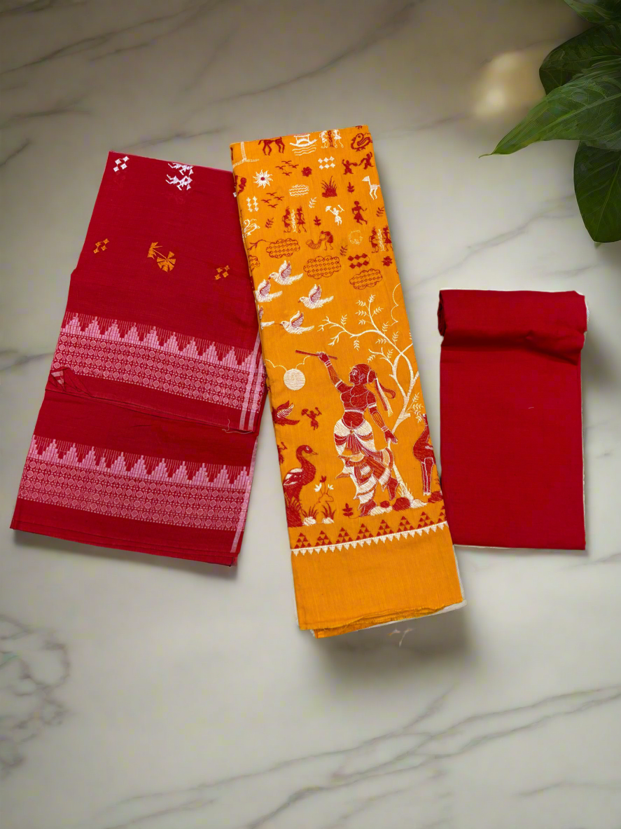 Weaver communities of Maniabandha and Nuapatana of Odisha traditionally weave this kind of saree. Common motifs are star, temple, conch, rudraksh, fish, chakra, lotus etc .The inspiration of all its designs comes from nature. The origin of Khandua traces back to 12th Century AD and it is closely associated with Lord Jagannath Temple rituals at Puri, Odisha. Originally designed using red, yellow, maroon, and cream colors, they contain Texts from the Gita Govinda. Gita Govinda or the song of Govinda is a work composed by the 12th century Indian poet Jayadeva. It describes the relationship between Krishna and the gopis (female cowherds), in particular Radha. Khandua is traditionally red or orange in color. The red color is prepared naturally from the shorea robusta (sal tree).The design motif has an auspicious elephant that represents Buddha surrounded by trailing vine with peacocks in it, a large many petaled flower, a unique Odisha's animal called Nabagunjar, a deula kumbha. The elephant in Khandua ikat from Nuapatana usually varies from elephant motives in ikat from sambalpuri saree as well as ikat from other parts of Orissa. Khandua has plain borders in contrary to borders with motifs in case of the other ikat of Odisha. During the rule of Gajapatis , Sarees are made and transported to jagannath temple. Khandua saree made of one piece of khandua silk called caukandika. Lightweight, soft, pocket-friendly, stunning. Khandua cottons are every woman's go-to sarees due to such endearing qualities.