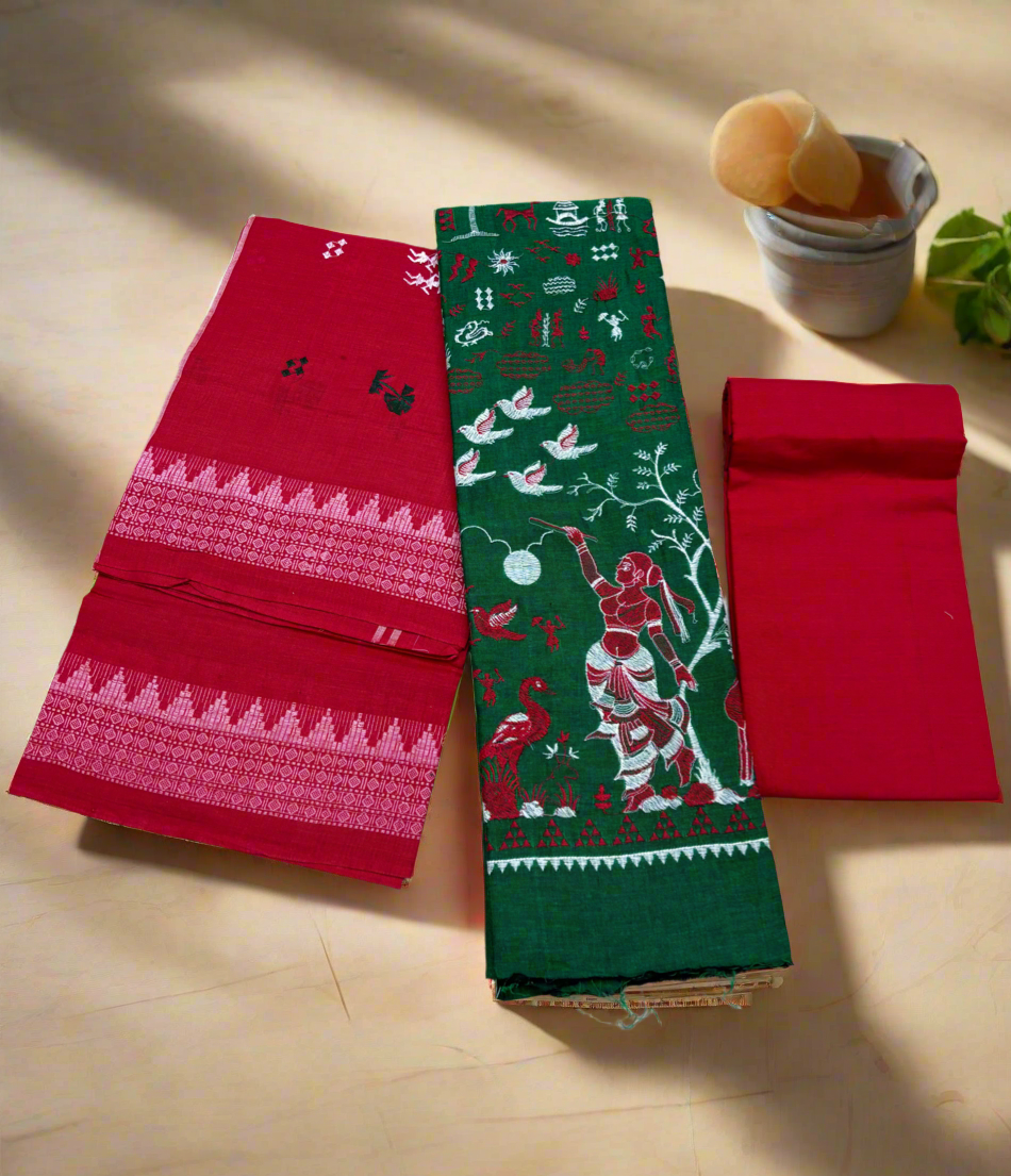 This material is a beautiful handloom dress material by a newcomer designer this design in women & girls ethnic wear multipurpose materials will love our light-weight. can be worn in casual, traditional, festival function, & daily wear. appreciated for attributes like color finishing high quality & smooth its loved in East, north & south India. this material is not readymade materials & all are women girls prefect fit or size
